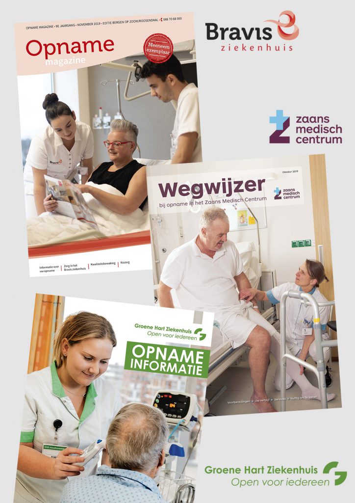 Deze week verschenen de geactualiseerde opnamemagazines van het Bravis ziekenhuis in Roosendaal en Bergen op Zoom, het Groene Hart Ziekenhuis in Gouda en het Zaans Medisch Centrum uit Zaandam. De magazines worden uitgedeeld bij de preoperatieve spreekuren en loggen ook ter inzage op de afdelingen en de poli’s. Alle onderwerpen die te maken hebben met een ziekenhuisopname worden overzichtelijk en duidelijk gerubriceerd vermeld in de magazines.