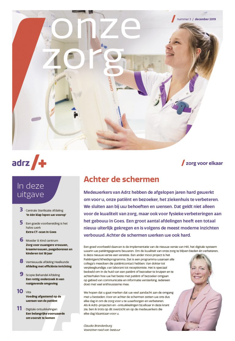 In Onze Zorg, het huis-aan-huis medium van het Admiraal de Ruyter ziekenhuis wordt onder andere de nieuwe CT-scan in Goes gepresenteerd. Ook staat de Scopie